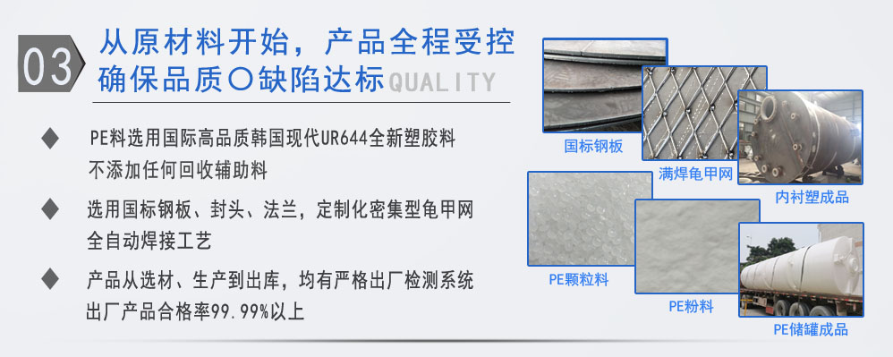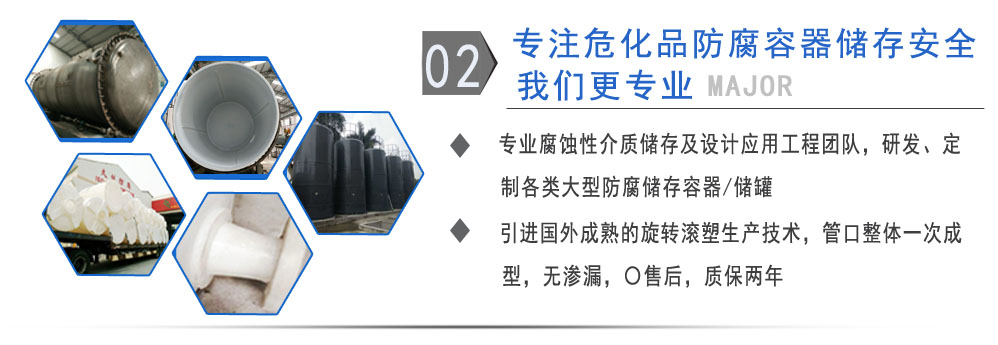 公司有鋼襯塑PE/PO、PE全塑、碳鋼、不銹鋼四大系列100多個品種,專注于常壓儲存容器生產,其產品包括鋼襯塑儲罐管口一體成型PE儲罐碳鋼儲罐不銹鋼儲罐、反應釜、攪拌罐、離子交換柱、鋼襯PE/PO儲罐塑料儲罐鹽酸儲罐、硫酸儲罐等等。更大限度滿足廣大客戶的各種需求,同時可以根據客戶的需要加工定制各種防腐設備。